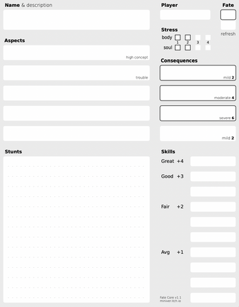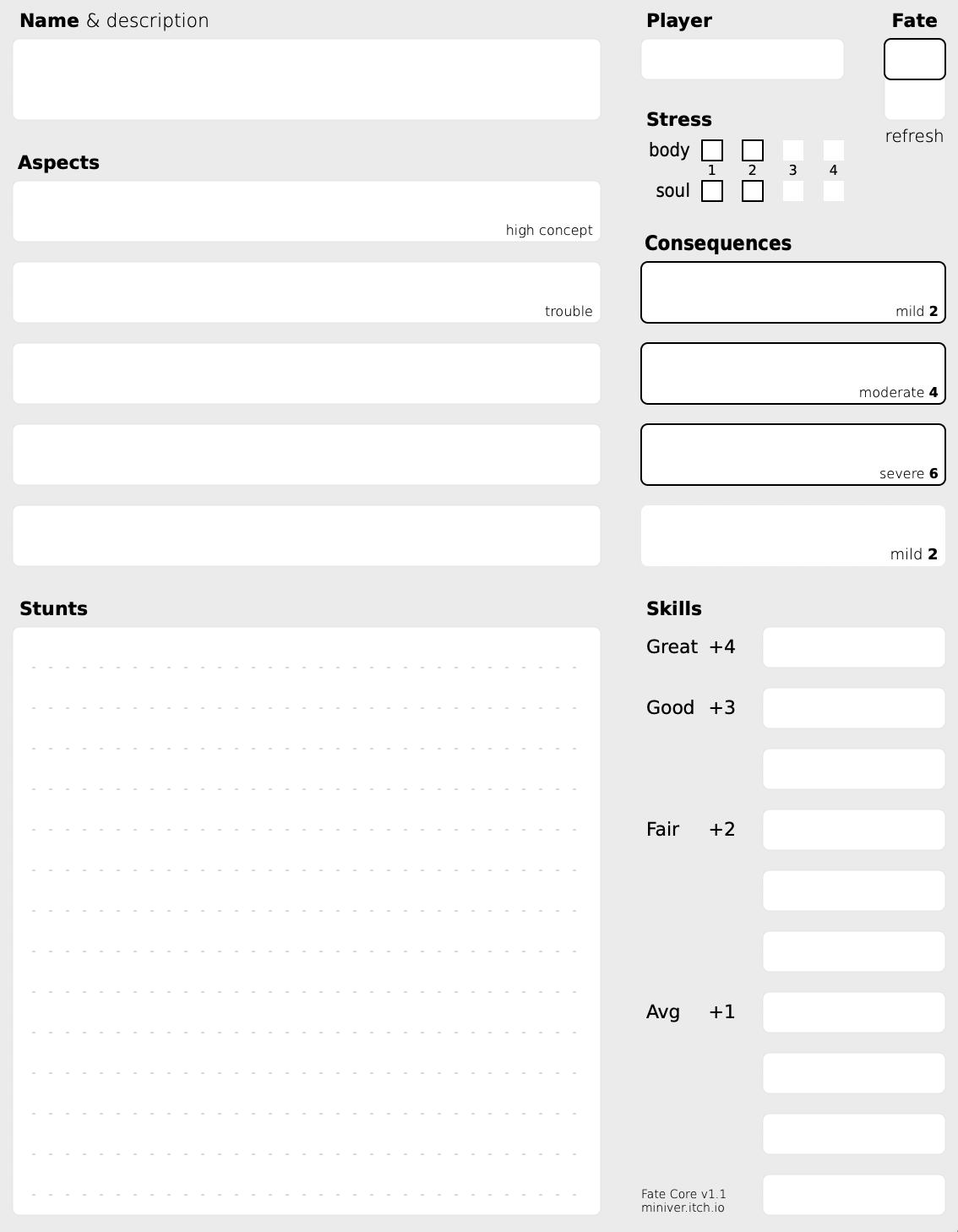 A simple sheet for a GM to use for keeping track of player characters’ essentials: aspects, stunts, and conditions.
