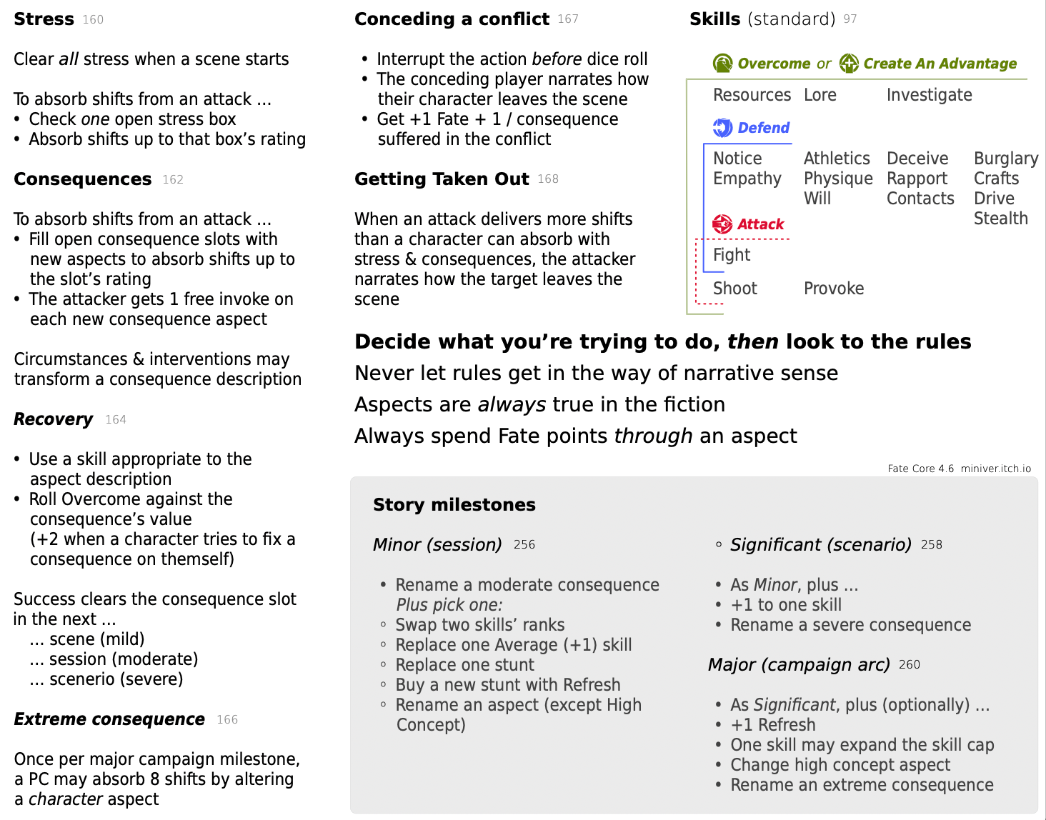 The third page is for GMs, describing their Fate points, setting up scenes, running contests, challenges, and conflicts, and more.